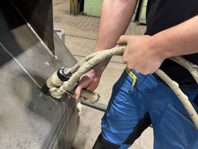 Do dutiny svařence jsme aplikovali litou PUR pěnu o hustotě 50 kg/m³, přičemž celkový objem výplně činil 2,5 m³. Tento typ izolace se často používá v průmyslových aplikacích, kde je potřeba vyplnit uzavřené konstrukční prostory a zlepšit jejich funkční vlastnosti.